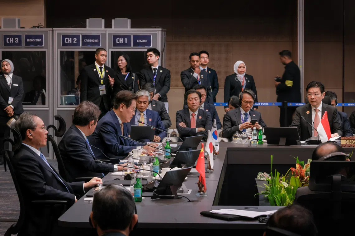 Prime Minister Lawrence Wong (right) attending a meeting with (from left) Chinese Premier Li Qiang, Japanese Foreign Minister Toshimitsu Motegi and South Korean President Lee Jae Myung at the Asean Plus Three Summit on Oct 26.